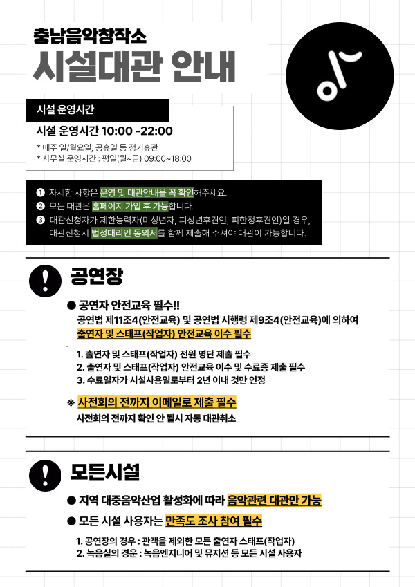 충남음악창작소는 대중음악산업 발전을 위해 추진한 지역기반형 사업으로 다양한 지원사업과 운영으로 뮤지션들이 다양한 음악콘텐츠를 창작할 수 있는 공간입니다.