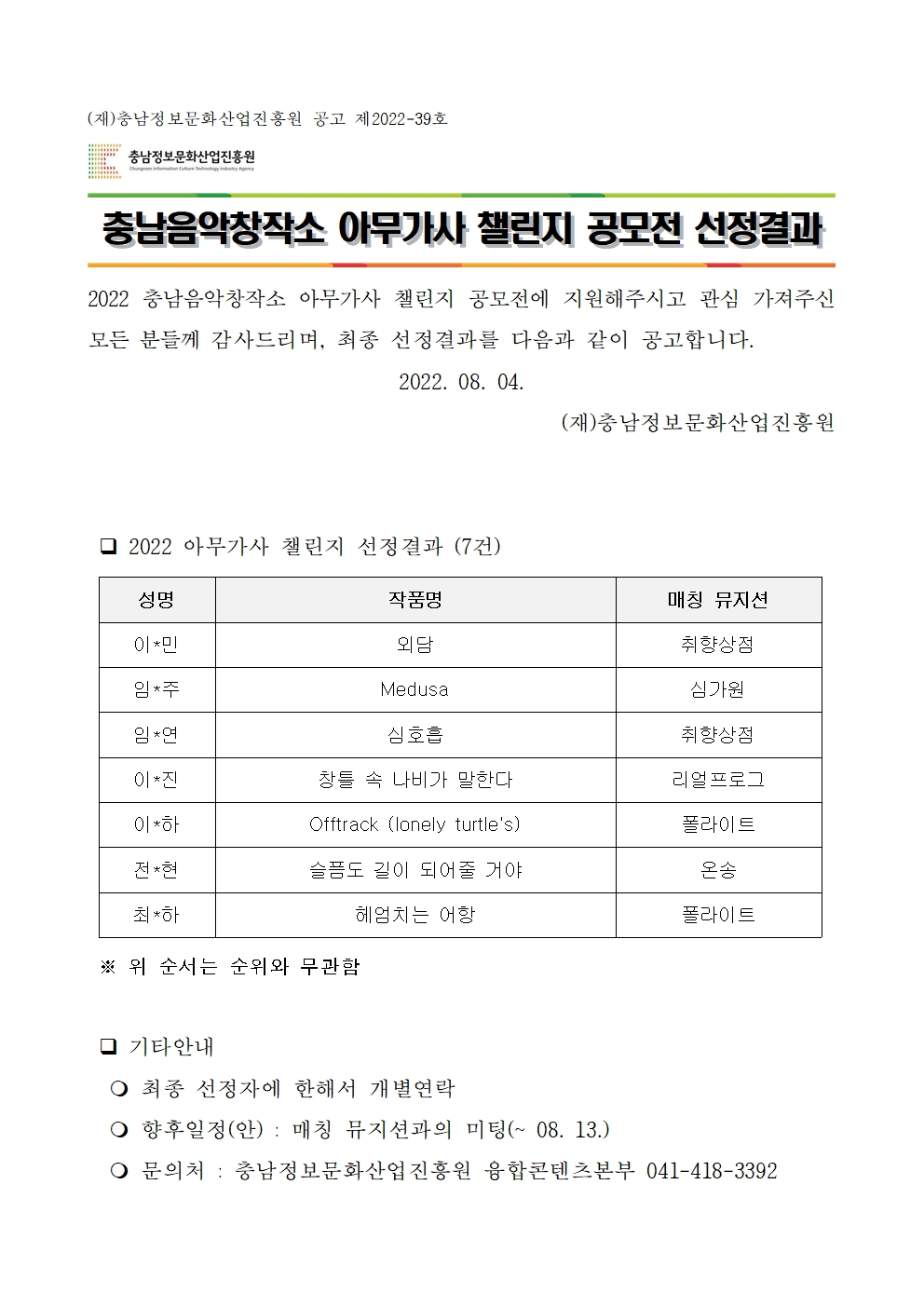 [공고] 충남음악창작소 아무가사 챌린지 공모전 선정결과