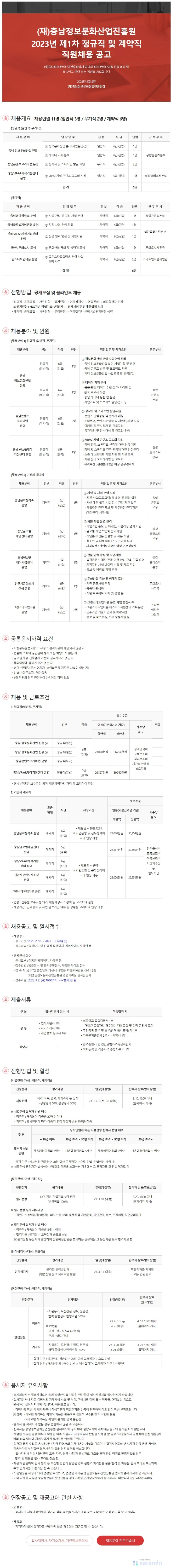 [공고] (재)충남정보문화산업진흥원 2023년 제1차 정규직 및 계약직 직원채용 작성자 : 관리자 등록일 : 2023-02-13 조회 : 835 1. 공고문 (충남정보문화산업진흥원 2023년 제1차 정규직 및 계약직 직원채용).pdf2. 입사지원서 자기소개서 개인정보동의서.hwp3. 직무기술서 (충남정보문화산업진흥원 2023년 제1차 정규직 및 계약직 직원채용).hwp