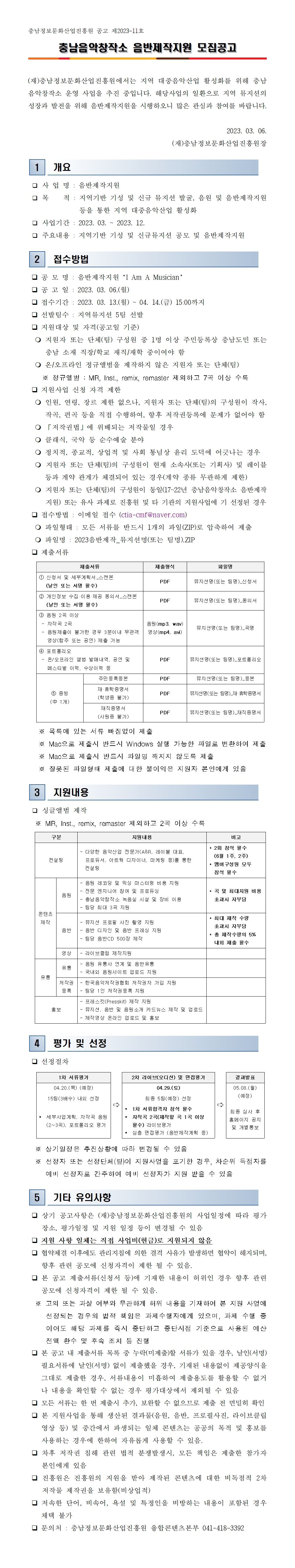 [공고] 2023 충남음악창작소 음반제작지원 'I Am A Musician' 모집 작성자 : 관리자 등록일 : 2023-03-06 조회 : 5028 [공고문] 2023 충남음악창작소 음반제작지원.pdf[신청서 및 계획서] 2023 충남음악창작소 음반제작지원.hwp[동의서] 2023 충남음악창작소 음반제작지원.hwp[참고] 제출서류 작성안내.pdf