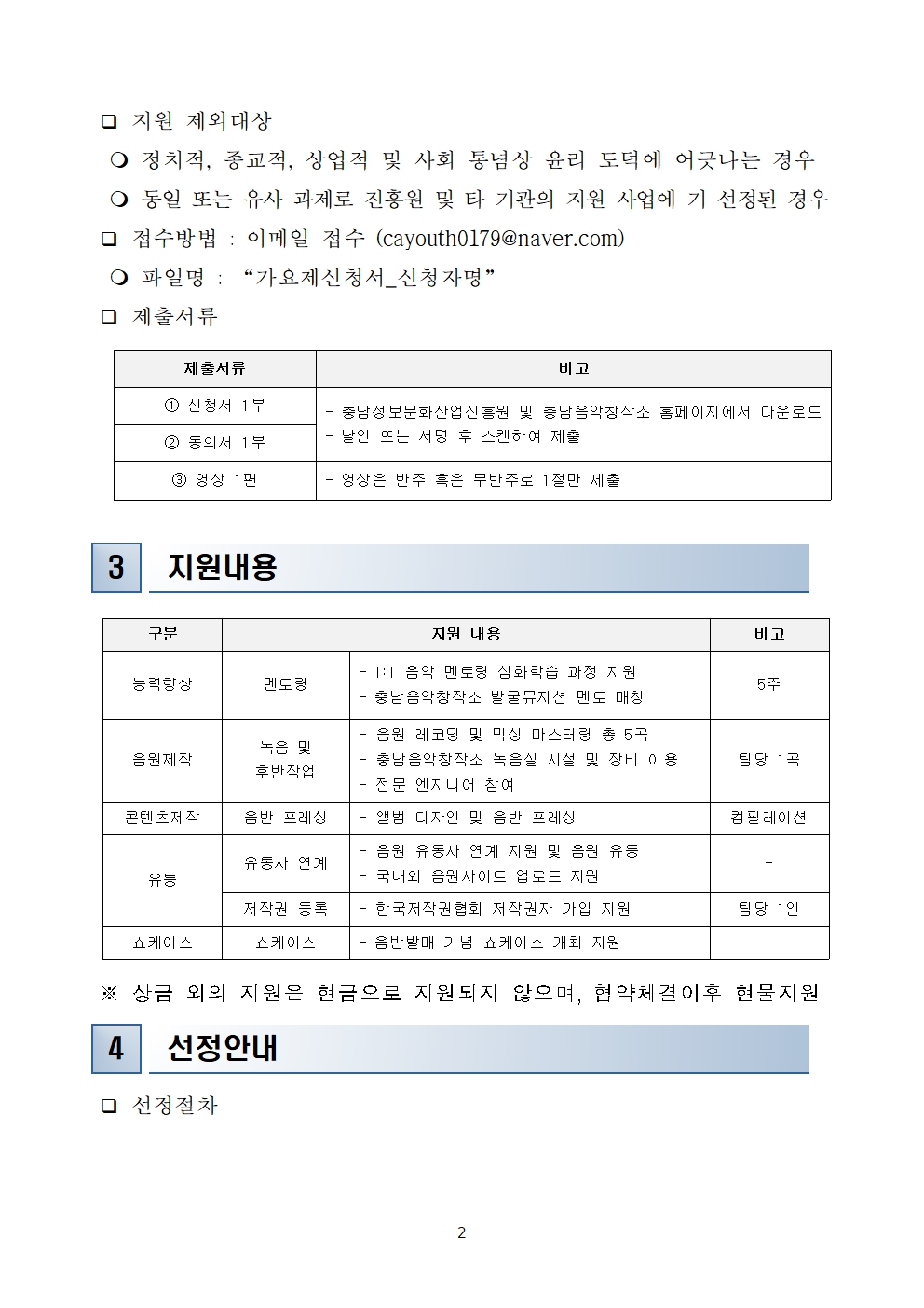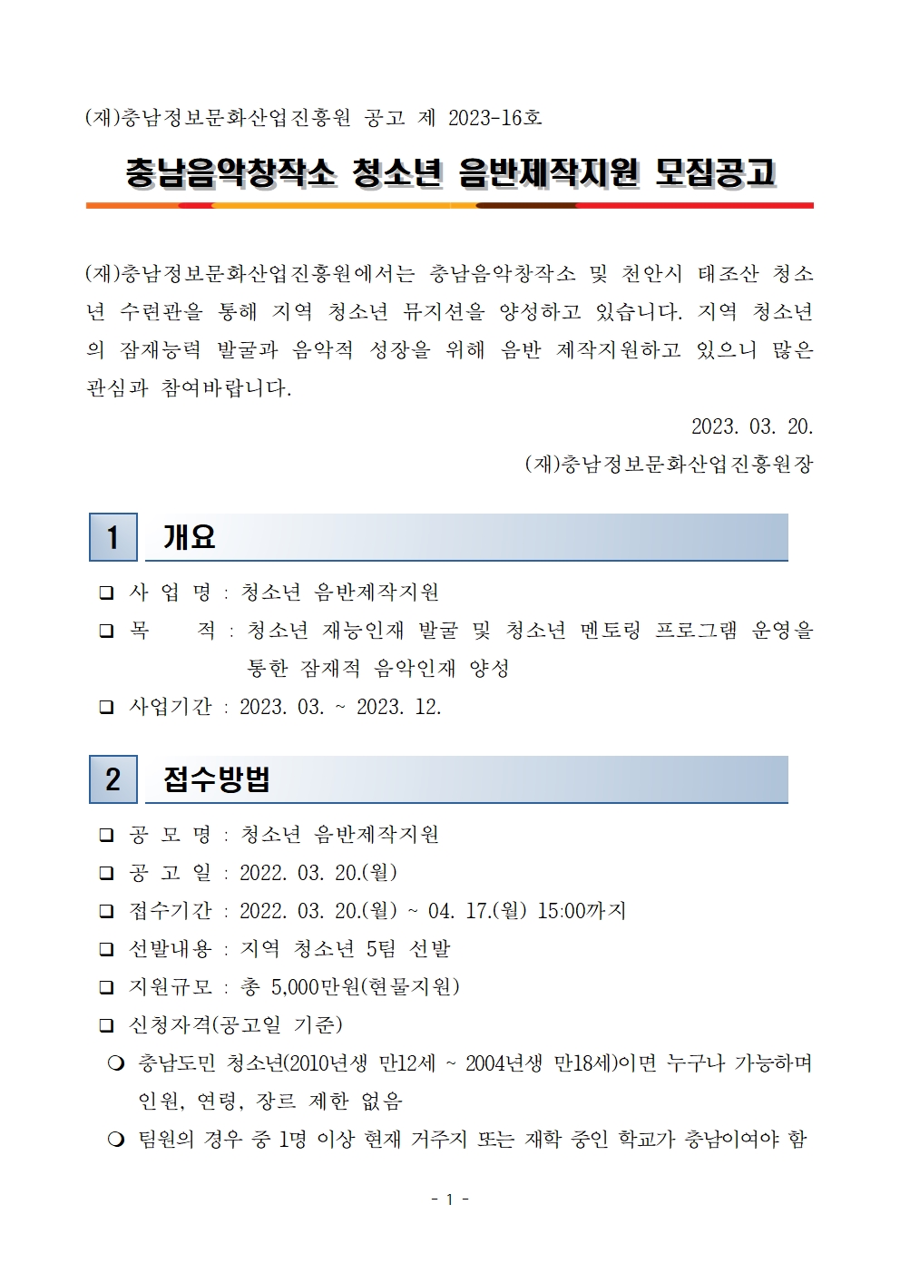 [공고] 충남음악창작소 청소년 음반제작지원 'Link up Musician X 23회 태조산청소년가요제' 모집 작성자 : 관리자 등록일 : 2023-03-20 조회 : 1466 청소년 제작지원 사업 참가신청서.hwp충남음악창작소 청소년 음반제작지원 모집공고문.pdf