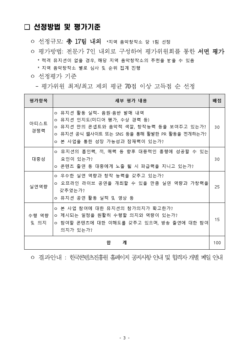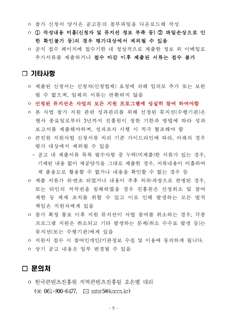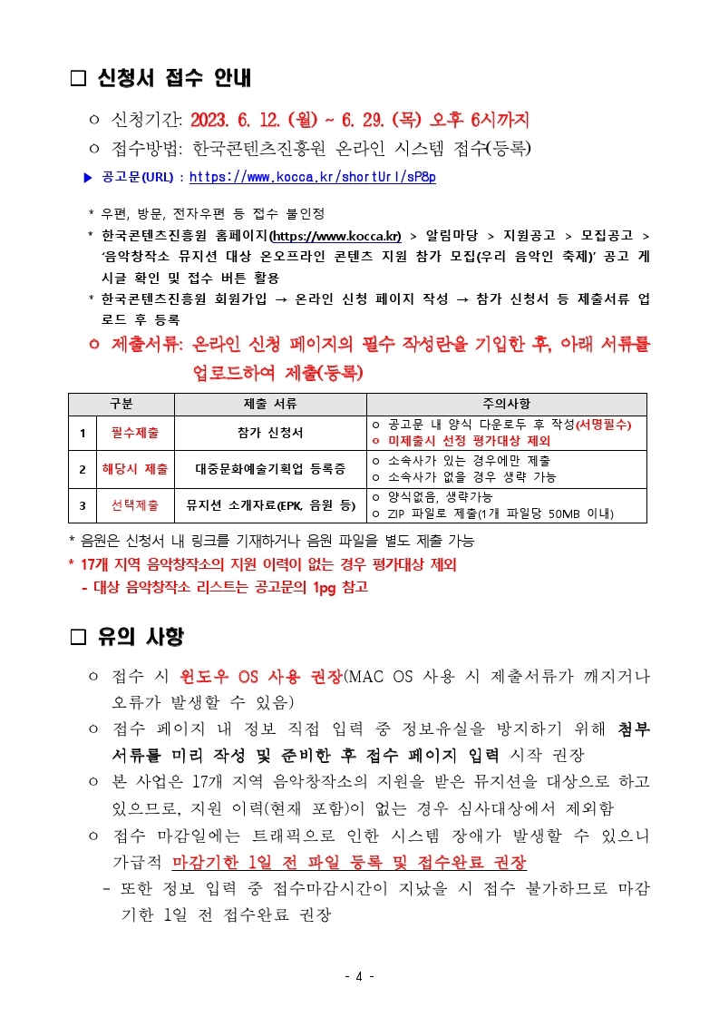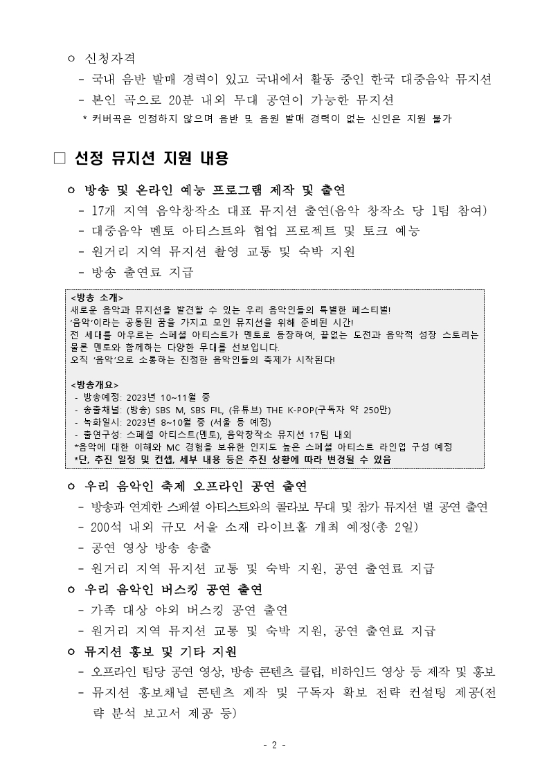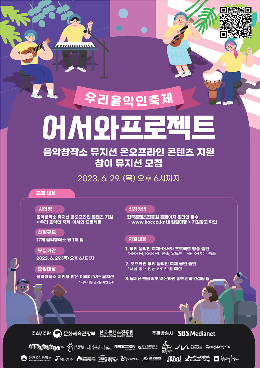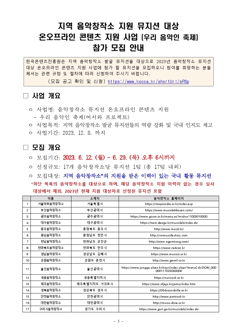 [한국콘텐츠진흥원] 지역 음악창작소 지원 뮤지션 대상 온오프라인 콘텐츠 지원사업(우리 음악인 축제) 참가 모집안내 작성자 : 관리자 등록일 : 2023-06-12 조회 : 1141 붙임01_모집공고문(총5쪽).pdf붙임02_참가신청서(양식).hwp붙임03_모집안내포스터.jpg