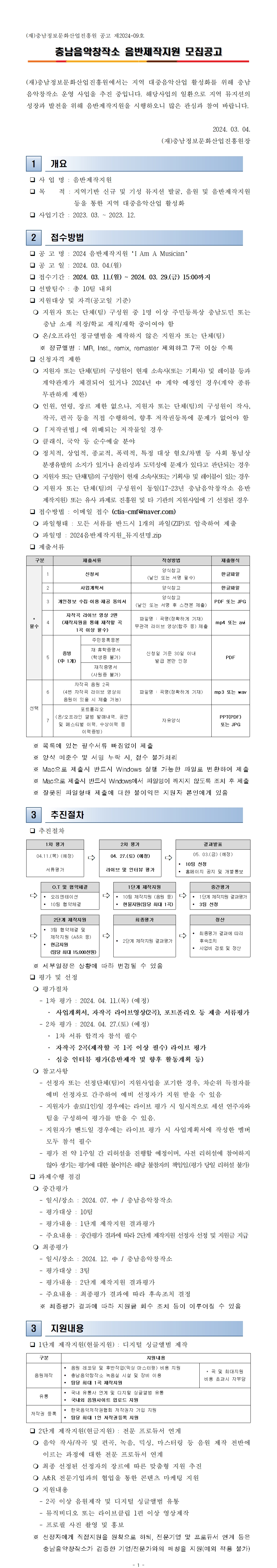[공고] 2024 충남음악창작소 음반제작지원 모집공고 작성자 : 관리자 등록일 : 2024-03-04 조회 : 6610 [공고문] 2024 충남음악창작소 음반제작지원 모집공고.pdf[붙임1] 신청서_2024 음반제작지원.hwp[붙임2] 사업계획서_2024 음반제작지원.hwp[붙임3] 참여인력 개인정보동의서_2024 음반제작지원.hwp[참고] 제출서류 작성안내.pdf