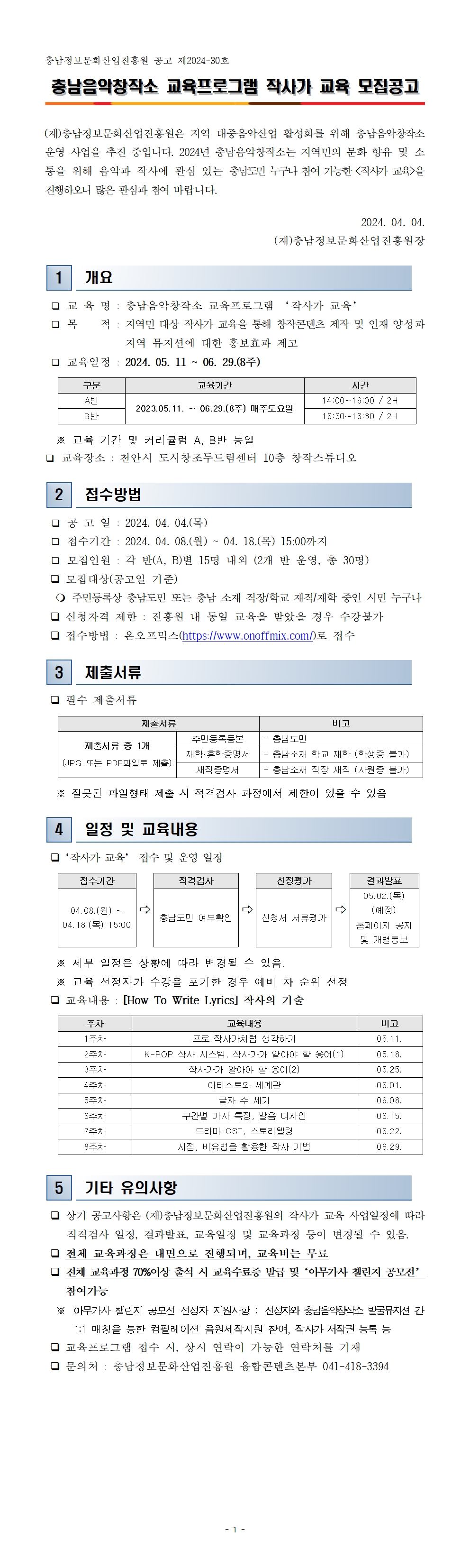 [공고] 2024 충남음악창작소 교육프로그램 '작사가 교육' 수강생 모집 작성자 : 관리자 등록일 : 2024-04-04 조회 : 3165 신청 바로가기 [공고문] 2024 충남음악창작소 교육프로그램 작사가 교육 수강생 모집.pdf[예시] 교육신청서.pdf