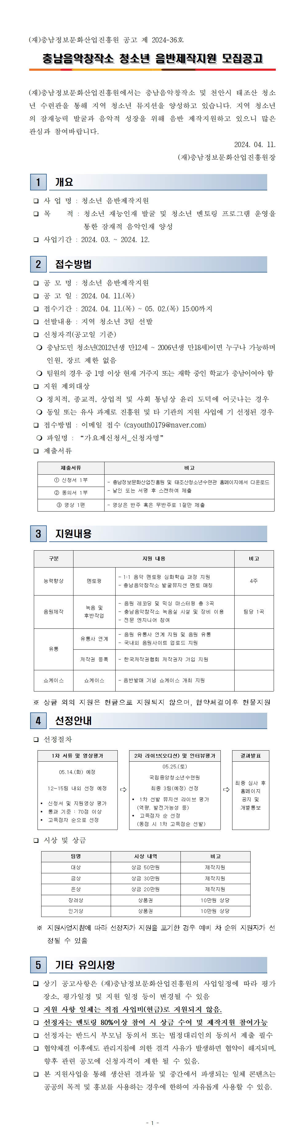 [공고] 2024 충남음악창작소 청소년 음반제작지원 모집공고 작성자 : 관리자 등록일 : 2024-04-11 조회 : 2179 [공고문]충남음악창작소 청소년 음반제작지원 모집공고.pdf1. 참가신청서 및 개인정보동의서(양식).hwp