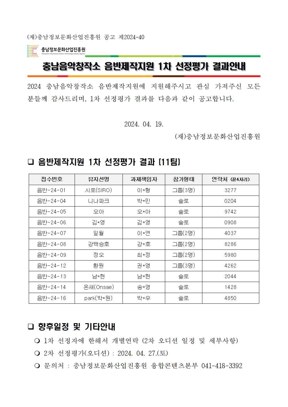[공고] 충남음악창작소 음반제작지원 1차 선정평가 결과안내