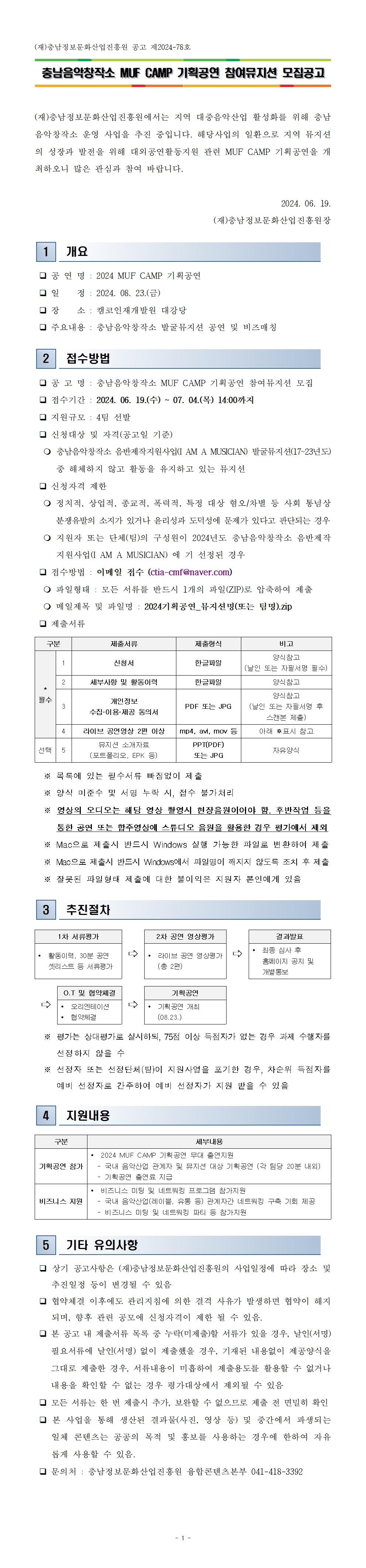 [공고] 충남음악창작소 MUF CAMP 기획공연 참여뮤지션 모집 작성자 : 관리자 등록일 : 2024-06-19 조회 : 1223 [공고문] 충남음악창작소 MUF CAMP 기획공연 참여뮤지션 모집.pdf[신청서] 충남음악창작소 MUF CAMP 기획공연 참여뮤지션 모집.hwp[붙임1] 신청서_충남음악창작소 MUF CAMP 기획공연 참여뮤지션.hwp[붙임2] 세부사항 및 활동이력_충남음악창작소 MUF CAMP 기획공연 참여뮤지션.hwp[붙임3] 참여인력 개인정보동의서_충남음악창작소 MUF CAMP 기획공연 참여뮤지션 모집.hwp
