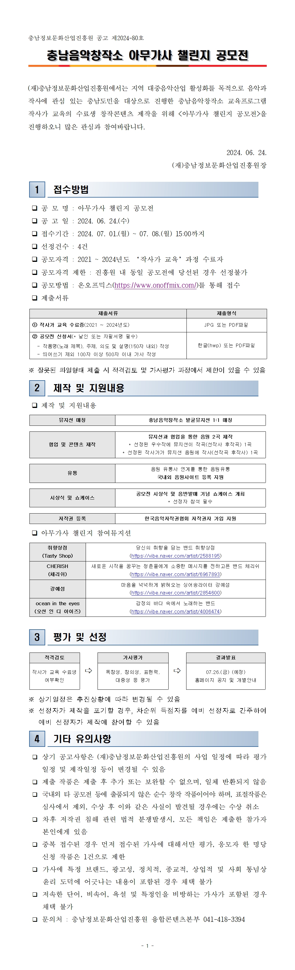 [공고] 2024 충남음악창작소 아무가사 챌린지 공모전 작성자 : 관리자 등록일 : 2024-06-24 조회 : 4215 신청 바로가기 [공고문] 충남음악창작소 아무가사 챌린지 공모전.pdf[신청서(양식)] 충남음악창작소 아무가사 챌린지 공모전.hwp