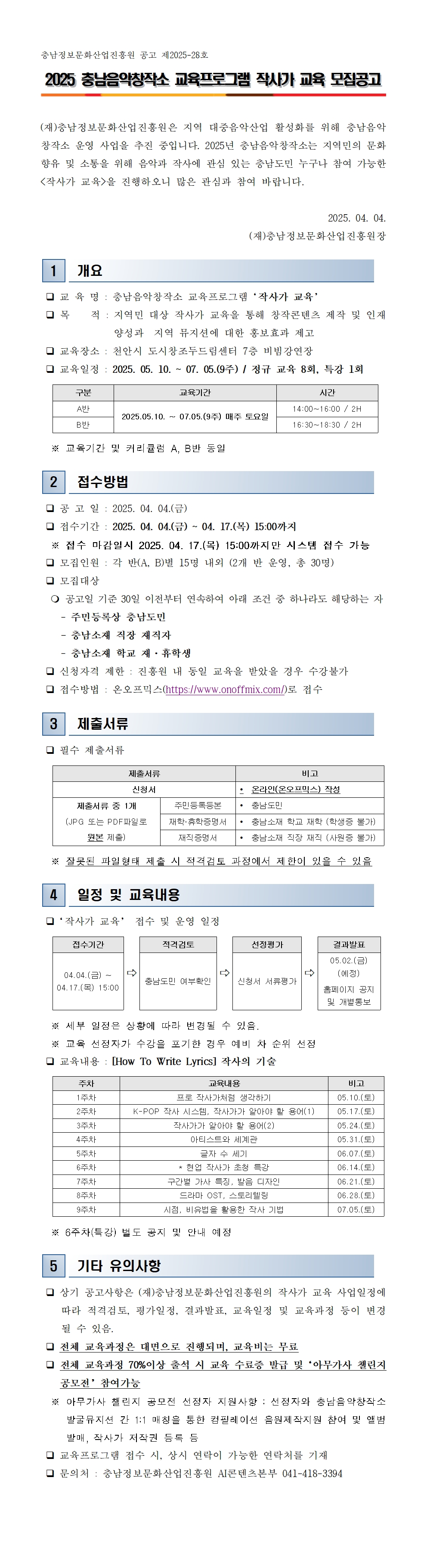 [공고] 2025 충남음악창작소 교육프로그램 '작사가 교육' 수강생 모집
