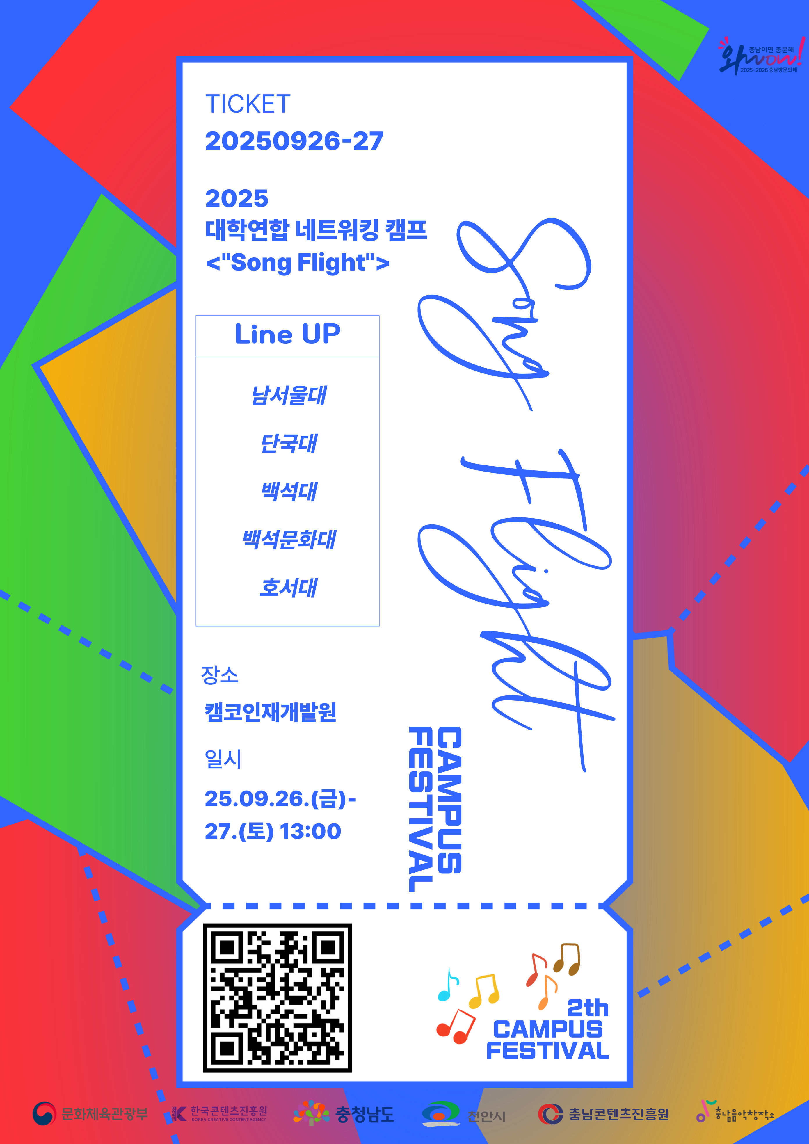 지원사업 2025 대학연합 네트워킹 캠프 Song Flight 기간 2025.09.26.~2025.09.27 대상 충남도내 음악 유관학과 재학생 장소 캠코인재개발원, 충남음악창작소 Live Hall 문의 041-418-3390 상세보기
